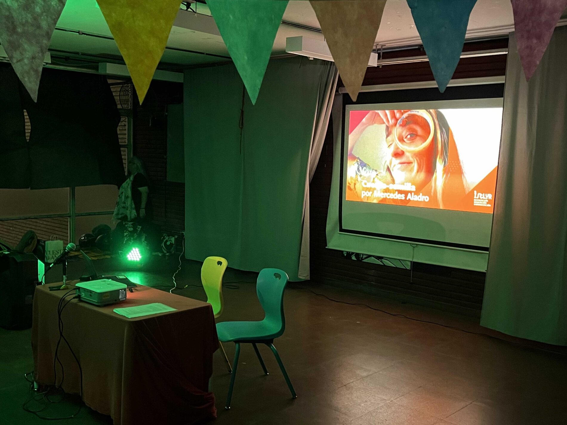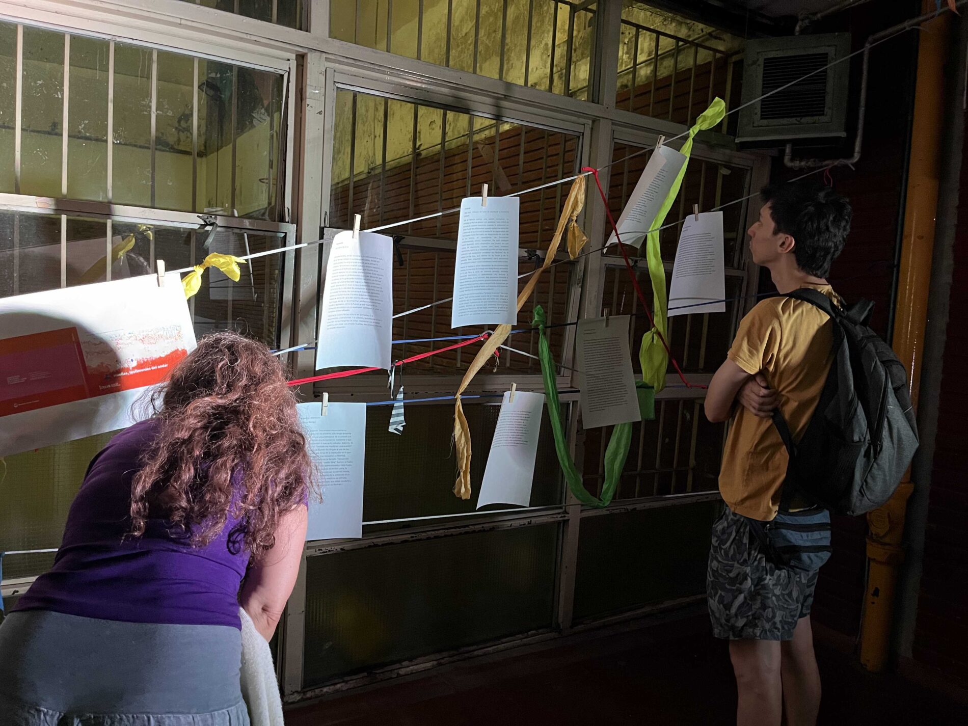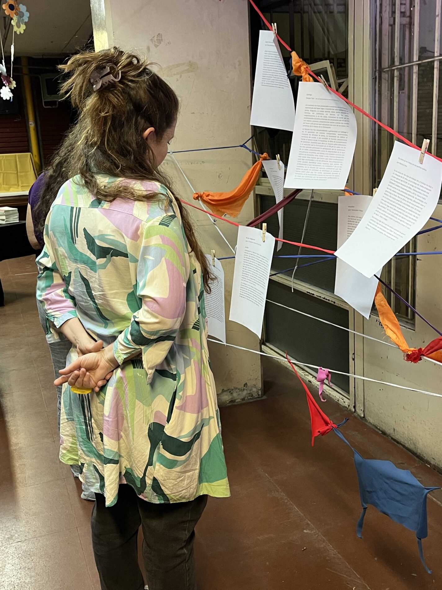 Al llegar, les invitades se encontraron con un tejido que albergaba telas, lanas y textos que invitaban a entregarse a la lectura de los fragmentos del dossier desplegados en el espacio de colores.